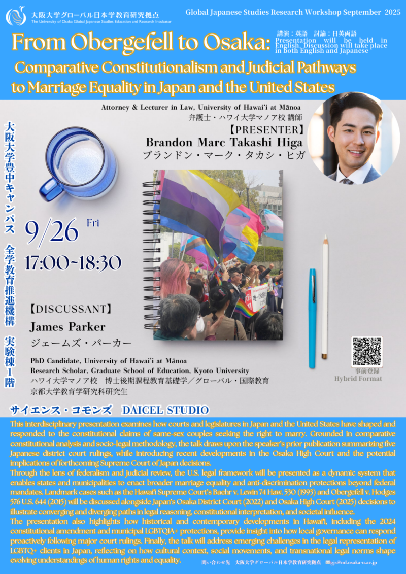 This interdisciplinary presentation examines how courts and legislatures in Japan and the United States have shaped and responded to the constitutional claims of same-sex couples seeking the right to marry. Grounded in comparative constitutional analysis and socio-legal methodology, the talk draws upon the speaker’s prior publication summarizing five Japanese district court rulings, while introducing recent developments in the Osaka High Court and the potential implications of forthcoming Supreme Court of Japan decisions.